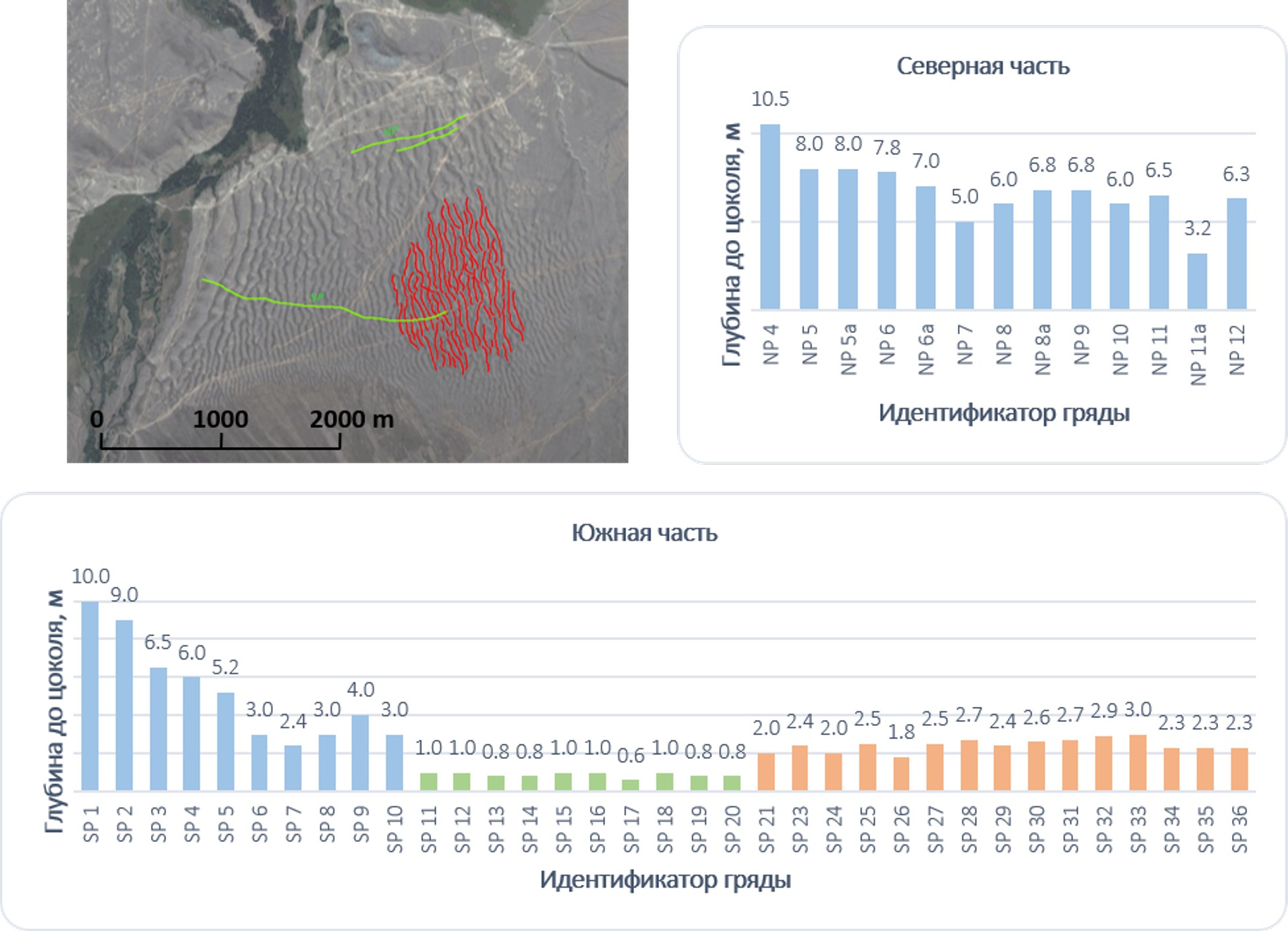 Получены новые данные, позволяющие лучше понять механизм формирования грядового рельефа Курайской котловины. По материалам дистанционного зондирования были рассчитаны морфометрические показатели длин гряд и распределение их особых точек. Эти показатели статистически сравнивались с аналогичными показателями, оцененными для грядовых ландшафтов различного генезиса: катафлювиальное грядовое поле, образованное прорывом оз. Мизула на западе США, суперпаводковые гряды в долине Енисея, современные русловые гряды крупной реки в Индии, поле ребристой морены на юге Скандинавии, бэровские бугры Прикаспийской низменности, эрозионные рисунки Лёссового плато (Китай). Установлено, что по статистическому распределению морфометрических параметров гряды Курайской котловины близки к грядовым полям – аккумулятивным формам, образованным на дне водных потоков, и значимо отличаются от моренных и эрозионных геоморфологических ландшафтов. Их внутреннее строение, определенное по данным георадиолокации, типично для русловых гряд на дне рек – в их поперечном сечении однозначно выделяются одна или несколько косослоистых пачек с падением слоев в направлении потока. Полученные результаты позволяют аргументированно оспорить ледниковую и остаточно-эрозионную гипотезы формирования гряд и подтвердить их происхождение в результате действия течения, формировавшегося при спуске ледниково-подпрудного озера, занимавшего Курайскую впадину. В ходе исследования были установлены новые детали механизма формирования гряд. Перепад высот между южной и северной перифериями грядового поля составляет 80 м. Выявлена связь размеров и внутреннего строения гряд с их положением, что может быть связано с глубиной формировавшего их течения. При малых глубинах на юге котловины формировались малые гряды, сложенные одной косослоистой пачкой отложений в ходе одного импульса. В северной части при больших глубинах поток двигался несколькими импульсами, что приводило к формированию крупных гряд, состоящих из нескольких косослоистых пачек отложений. Чтобы перепад высот влиял на процесс формирования гряд, средняя глубина потока не должна превышать 200–300 м, это позволяет предположить, что гряды формировались на финальной стадии спуска озера. Впервые установлено наличие в составе крупных гряд северной части поля покровных пачек отложений с обратным направлением слоистости, что указывает на возможность реверсивного движения потока на конечном этапе формирования гряд. Это свидетельствует о росте нестабильности течения и о появлении его быстрых разнонаправленных пульсаций на последней стадии осушения озера.