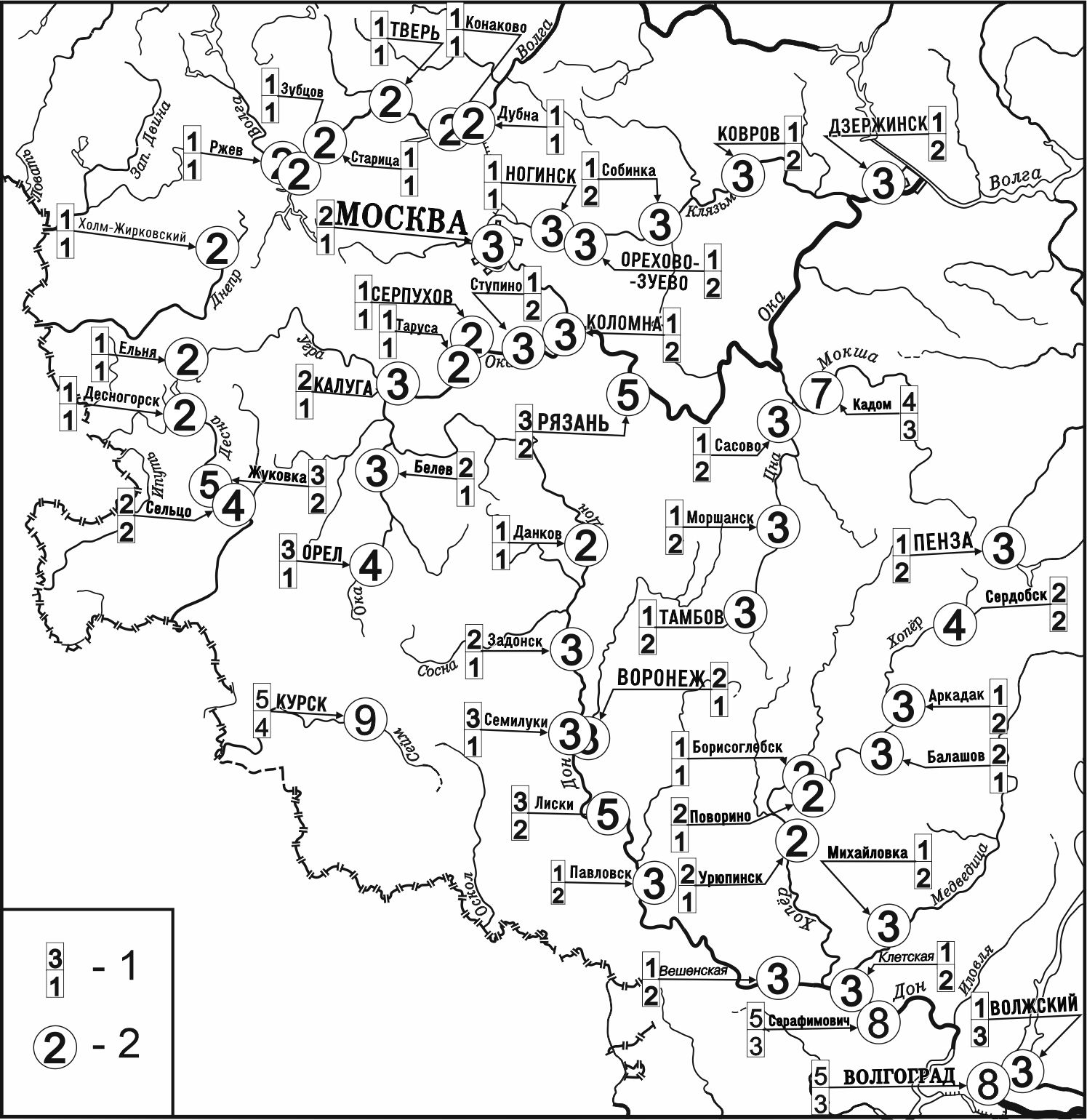 3. Положение малых значений влияния эрозионных и русловых процессов с ин-фраструктурой населенных пунктов (в баллах) на картосхеме геоморфологического районирования европейской территории СССР